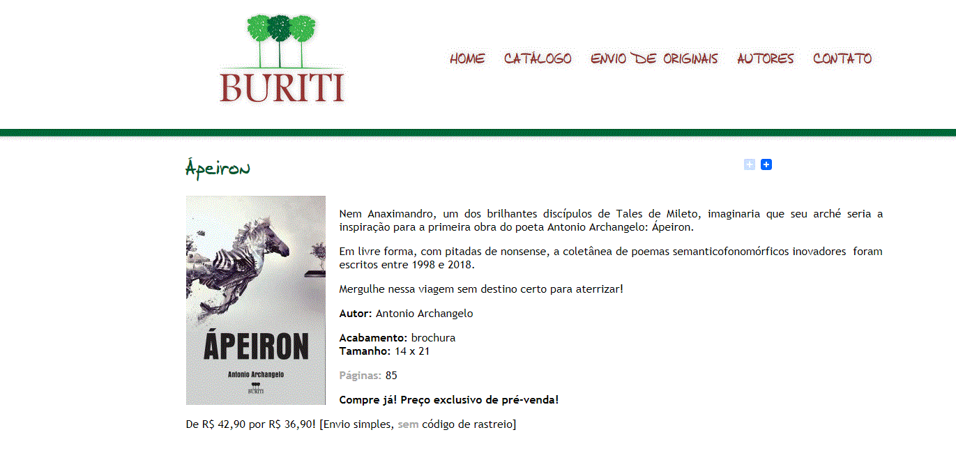 A Editora Buriti liberou em sua plataforma digital (http://editoraburiti.com.br/apeiron/) a pré-venda do primeiro livro do poeta Antonio Archangelo, denominado Ápeiron.