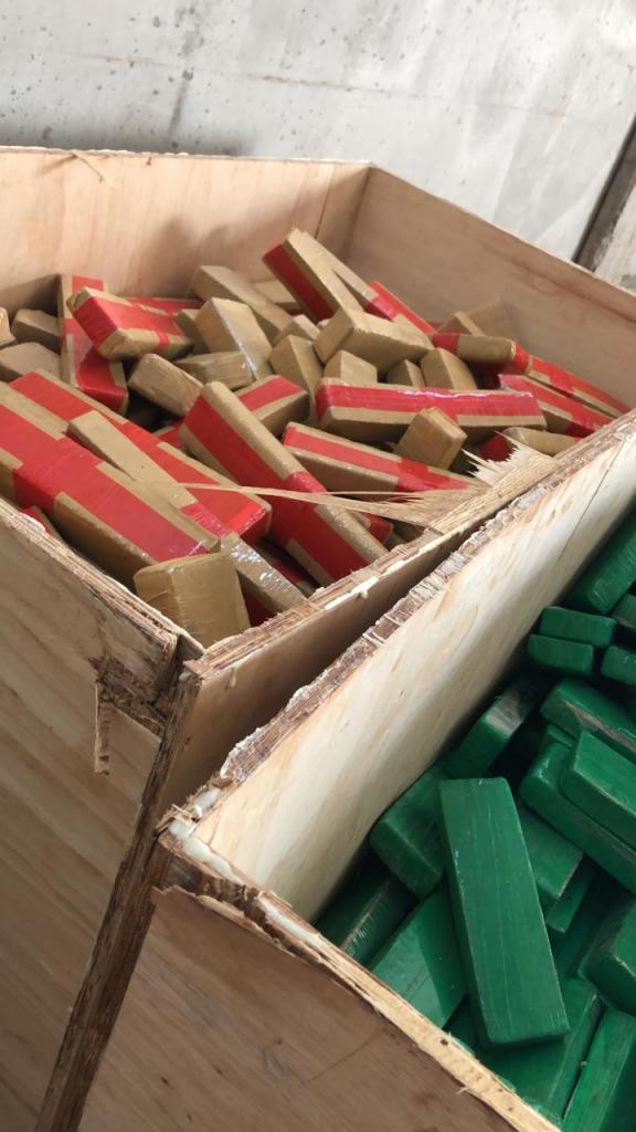 – Sete contêineres de madeira com toneladas de maconha (a ser pesada);