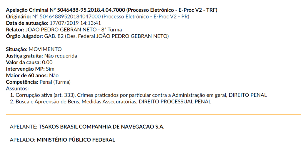 “Ao contrário do que sustenta, há elementos que indicam a relação entre a apelante e o Grupo Tsakos, bem como com o investigado Konstatinos. Ainda que a pessoa jurídica não seja aquela que teria se beneficiado com os contratos firmados com a Petrobras, há ligações societárias que autorizam, pelo menos nesse momento, a manutenção do bloqueio”, afirmou Gebran.