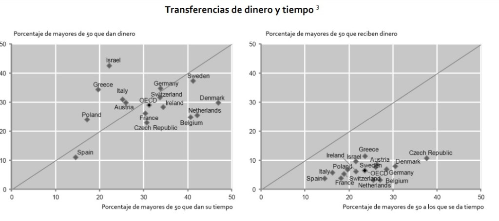 Nos casos em que os idosos não precisam ser atendidos, combinam tempo e dinheiro (dando suas pensões e cuidando dos mais jovens), envidando um esforço de contribuição máxima, que paradoxalmente também promove e fortalece o relacionamento com seus netos, quando anteriormente era fraco ou inexistente? No nível europeu, os idosos fornecem uma quantidade maior de tempo e dinheiro em comparação aos jovens. Segundo um estudo da OCDE, há uma diferença notável entre doações em dinheiro e tempo que os idosos dão e aqueles que recebem.