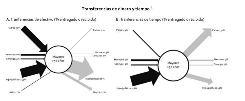 O tamanho das setas varia com a proporção do total de transferências de cada tipo indo em cada direção. Os idosos recebem dinheiro principalmente de seus filhos, embora seus pais sejam um recurso substancial. Muito poucas transferências financeiras são ascendentes – para os pais – ou horizontais, para irmãos ou esposas. As crianças representam dois terços das transferências de dinheiro feitas pelos idosos. O estudo também fornece evidências da magnitude das transferências.