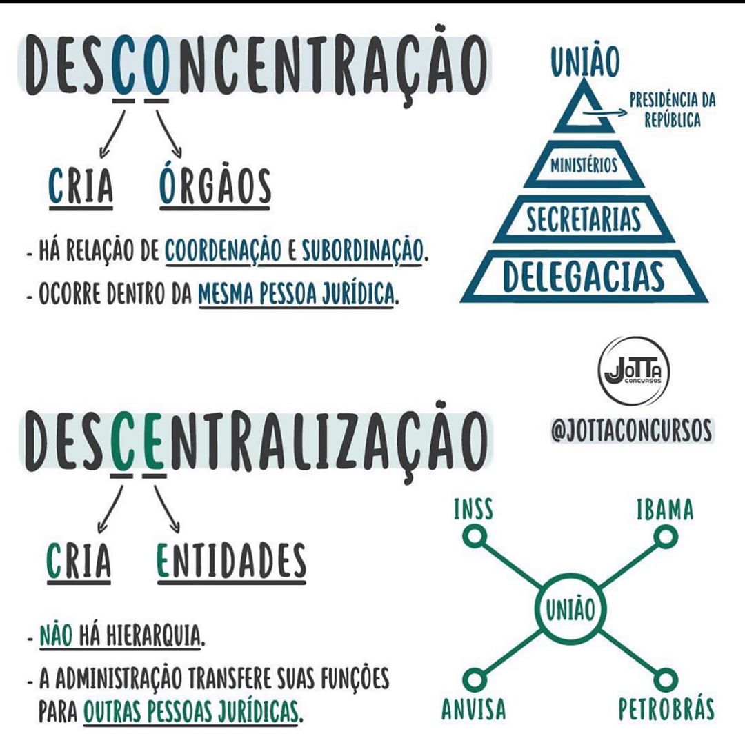 | Autonomia administrativa | Os entes descentralizados têm autonomia relativa | Os órgãos desconcentrados não têm autonomia |