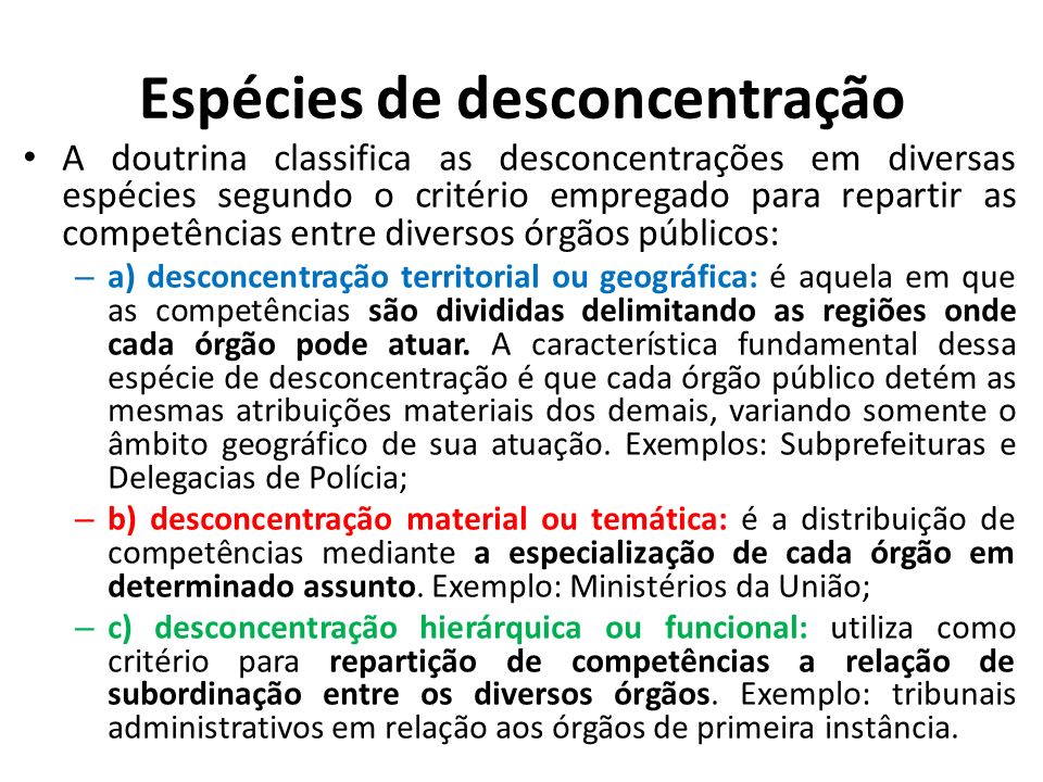 A desconcentração é uma distribuição interna de competências, ou seja, uma distribuição de competências dentro da mesma pessoa jurídica.