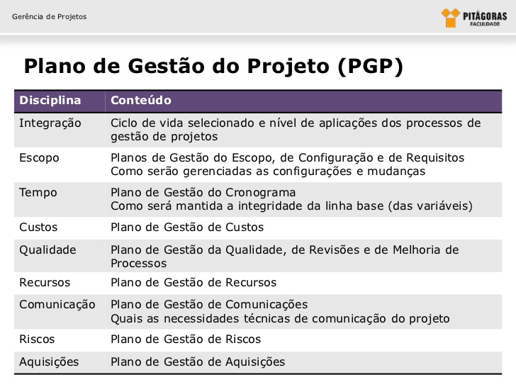 Visa a documentação das ações necessárias para definir, preparar, integrar e coordenar os planos de gerenciamento específicos de cada uma das áreas de conhecimento do gerenciamento de projetos, para gerar o documento de planejamento do projeto, chamado de Plano de Gerenciamento do Projeto – PGP. Este documento também define como o projeto será executado, monitorado, controlado e encerrado.