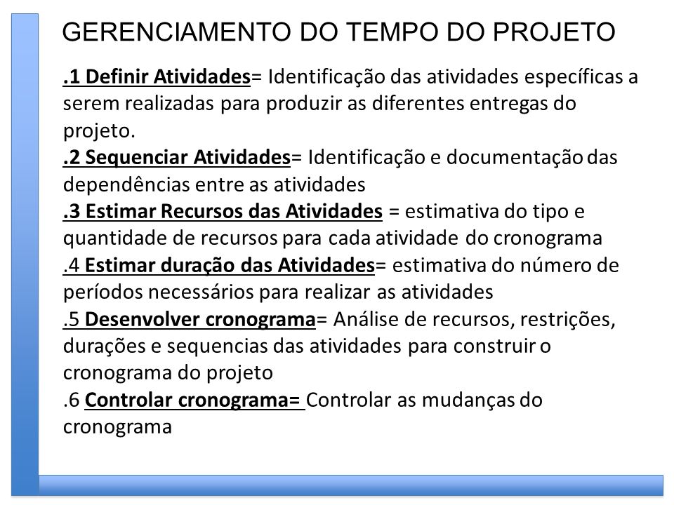 .1 Definir Atividades= Identificação das atividades específicas a serem realizadas para produzir as diferentes entregas do projeto. .2 Sequenciar Atividades= Identificação e documentação das dependências entre as atividades. .3 Estimar Recursos das Atividades = estimativa do tipo e quantidade de recursos para cada atividade do cronograma. .4 Estimar duração das Atividades= estimativa do número de períodos necessários para realizar as atividades. .5 Desenvolver cronograma= Análise de recursos, restrições, durações e sequencias das atividades para construir o cronograma do projeto. .6 Controlar cronograma= Controlar as mudanças do cronograma. Disponível em <https://slideplayer.com.br/slide/40366/&gt; Acesso 29.ago.2020