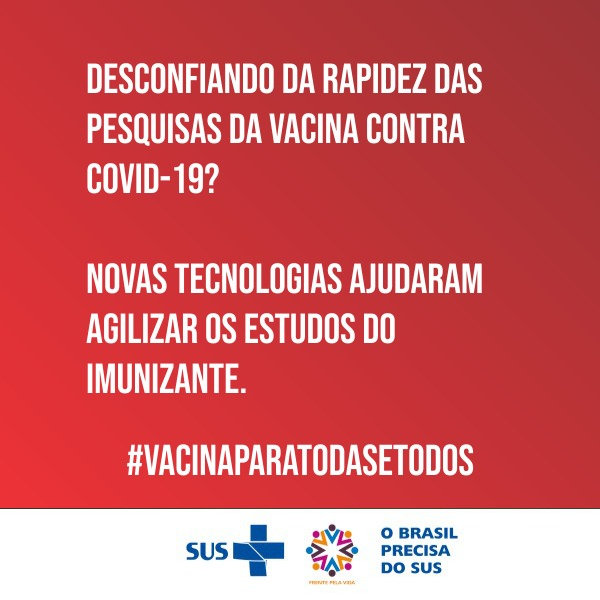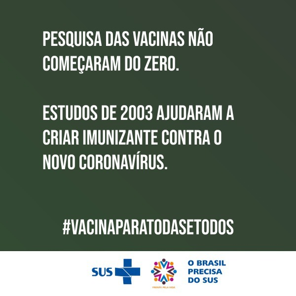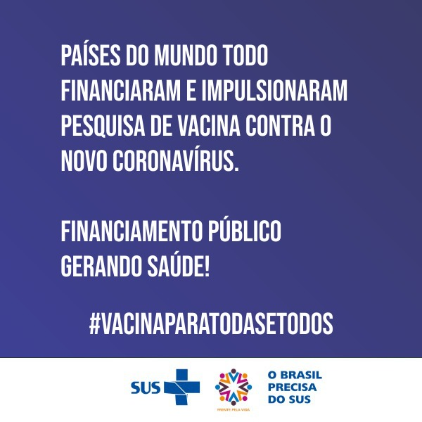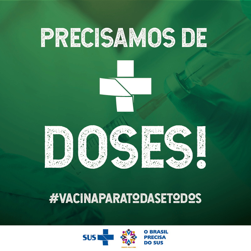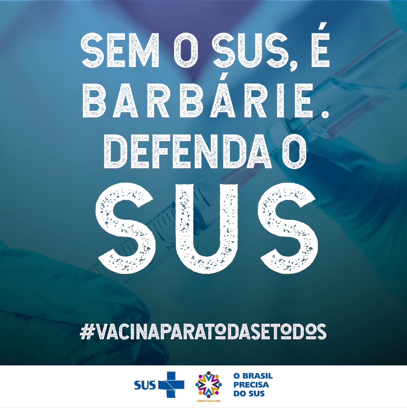 A saúde do Brasil precisa do SUS. A economia do Brasil precisa do SUS. O povo brasileiro precisa do SUS forte, público, integral e universal. Defender o SUS é defender a vida. Vacina para todas e todos! Junte-se a esta campanha.  O Brasil precisa do SUS.