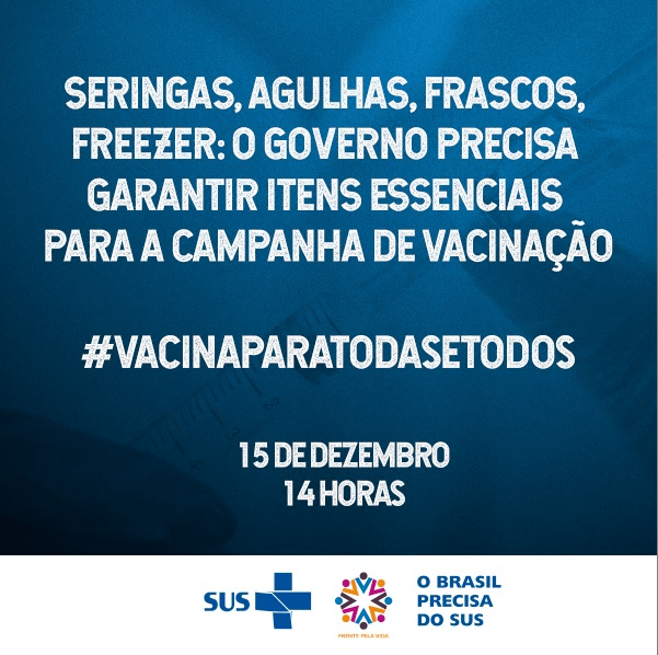 A saúde do Brasil precisa do SUS. A economia do Brasil precisa do SUS. O povo brasileiro precisa do SUS forte, público, integral e universal. Defender o SUS é defender a vida. Junte-se a esta campanha. Vacina para todas e todos! O Brasil precisa do SUS.