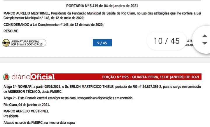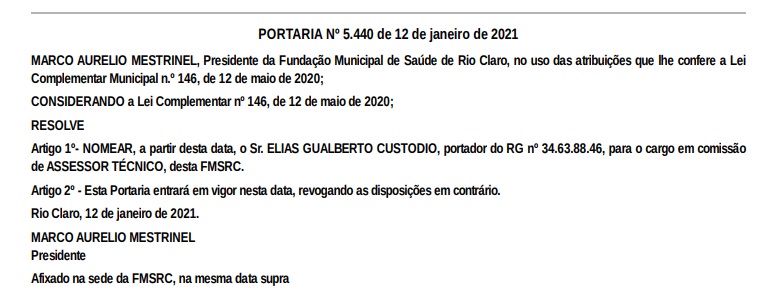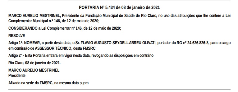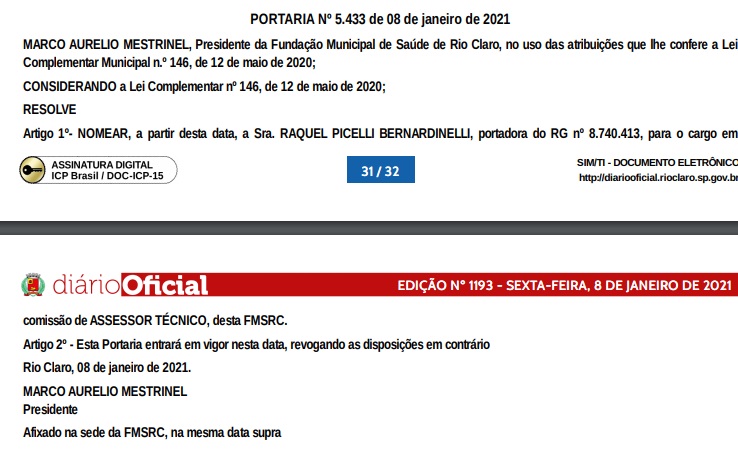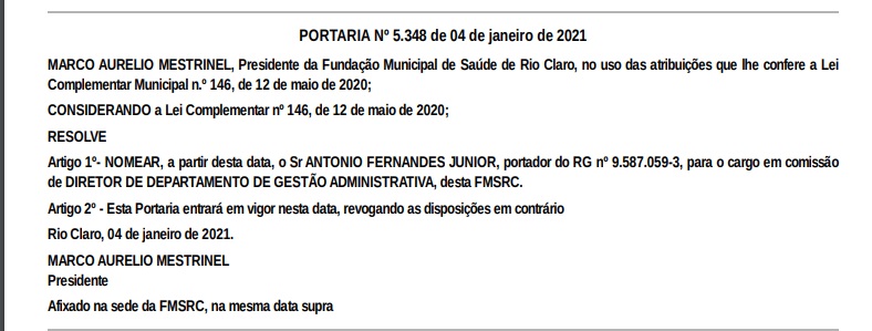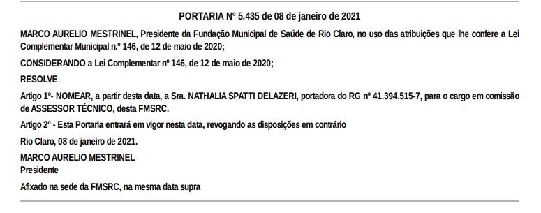 Confira as nomeações de fora do quadro de efetivos realizadas, até o momento, no SUS em Rio Claro via Fundação Municipal de Saúde: