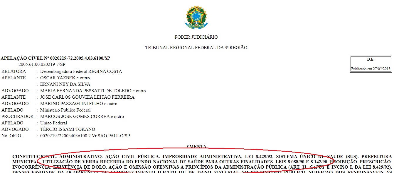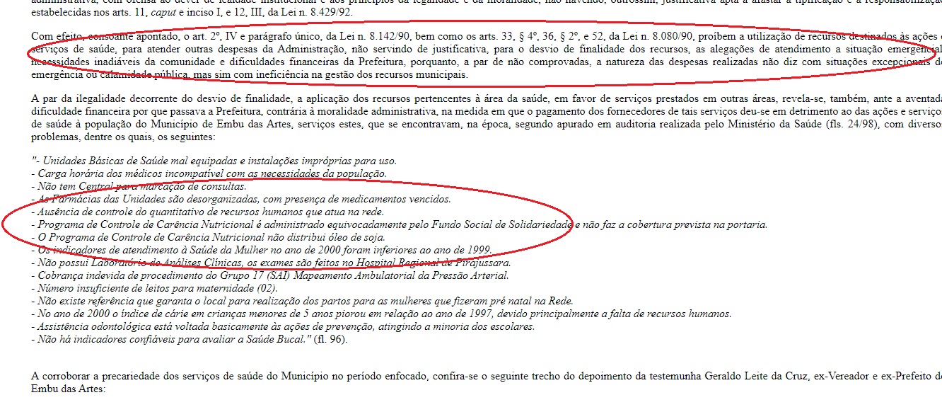 Entre os diversos casos, em 2005, o Ministério Público Federal conseguiu a condenação do prefeito e secretário de finanças do município de Embu das Artes/SP pelo desvio de finalidade na aplicação de recursos da saúde: