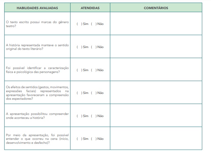 | Objetivos da aula: • Verificar se as produções possuem as marcas do gênero teatro e se a história manteve o sentido do original; • Promover uma autoavaliação, verificando se as produções contribuíram para a ampliação dos conhecimentos referentes aos gêneros textuais – texto literário escolhido e texto teatral; • Avaliar a atuação individual e a interação com o grupo. |