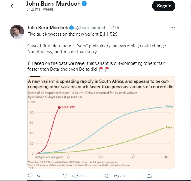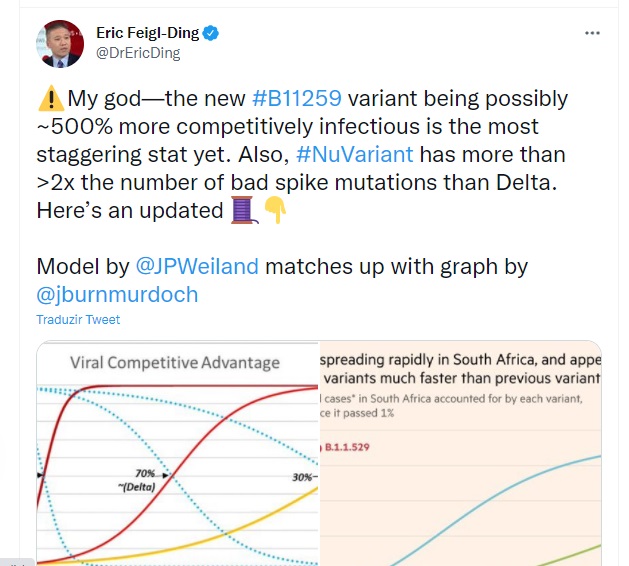 “Meu Deus – a nova variante #B11259 sendo possivelmente cerca de 500% mais infecciosa em termos competitivos é a estatística mais impressionante até agora. Além disso, #NuVariant tem mais do que > 2x o número de mutações de pico ruins do que a Delta” disse. Até o momento, há um caso confirmado da variante Nu na Bélgica, um caso em Israel e 2 casos pegos na quarentena de um hotel de Hong Kong.