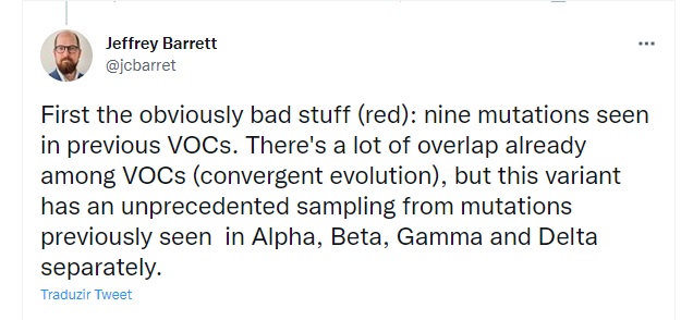 Jeffrey Barrett, diretor científico da Nightingale Health e líder do rastreamento genômico da Covid-19, disse em seu twitter que detectou “nove mutações vistas anteriormente […], mas esta variante tem uma amostra sem precedentes de mutações vistas anteriormente em Alfa, Beta, Gama e Delta separadamente”.