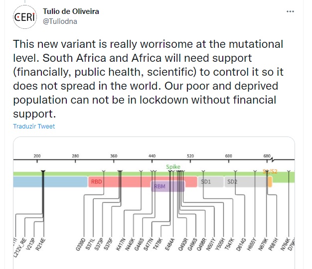 “Esta nova variante é realmente preocupante no nível mutacional. A África do Sul e a África precisarão de apoio (financeiro, de saúde pública, científico) para controlá-la para que não se espalhe pelo mundo. Nossa população pobre e carente não pode ficar presa sem apoio financeiro” desabafou.