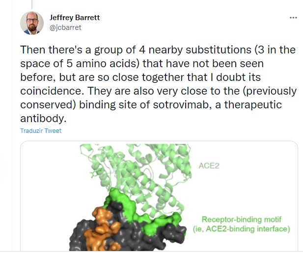 “Há um grupo de 4 substituições próximas que não foram vistas antes, mas estão tão próximas que dúvido de sua coincidência. Eles também estão muito próximos do local de ligação (previamente conservado) do sotrovimab, um anticorpo terapêutico” disse.