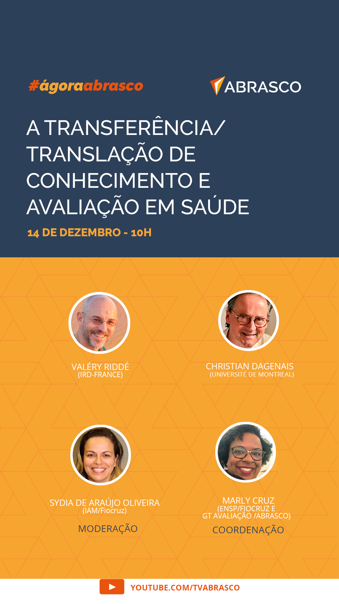 Com organização conjunta do Grupo Temático Avaliação em Saúde/Abrasco, Programa de Pós- Graduação de Saúde Pública da ENSP/Fiocruz, Programa de Pós-Graduação de Saúde Pública do Instituto Aggeu Magalhães, e apoio do programa Print Capes, a Ágora Abrasco realiza o painel Internacional: A transferência/ translação de conhecimento e avaliação em saúde. A sessão tem como objetivo apresentar e discutir as barreiras e potencialidades sobre a implementação das intervenções e/ou práticas baseadas em evidências no âmbito dos sistemas de saúde e o uso da avaliação na “tradução/transferência/translação” de conhecimento. A transmissãoserá realizada na próxima terça-feira, dia 14, às 10 horas, na TV Abrasco.