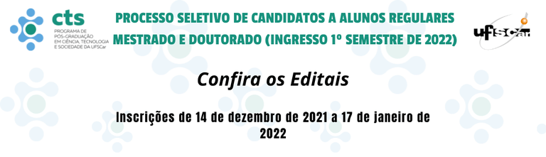 A Coordenação do Programa de Pós-Graduação em Ciência, Tecnologia e Sociedade da Universidade Federal de São Carlos (PPGCTS/UFSCar), tornou pública a abertura do processo seletivo para ingresso no curso de MESTRADO e DOUTORADO em Ciência, Tecnologia e Sociedade CTS).