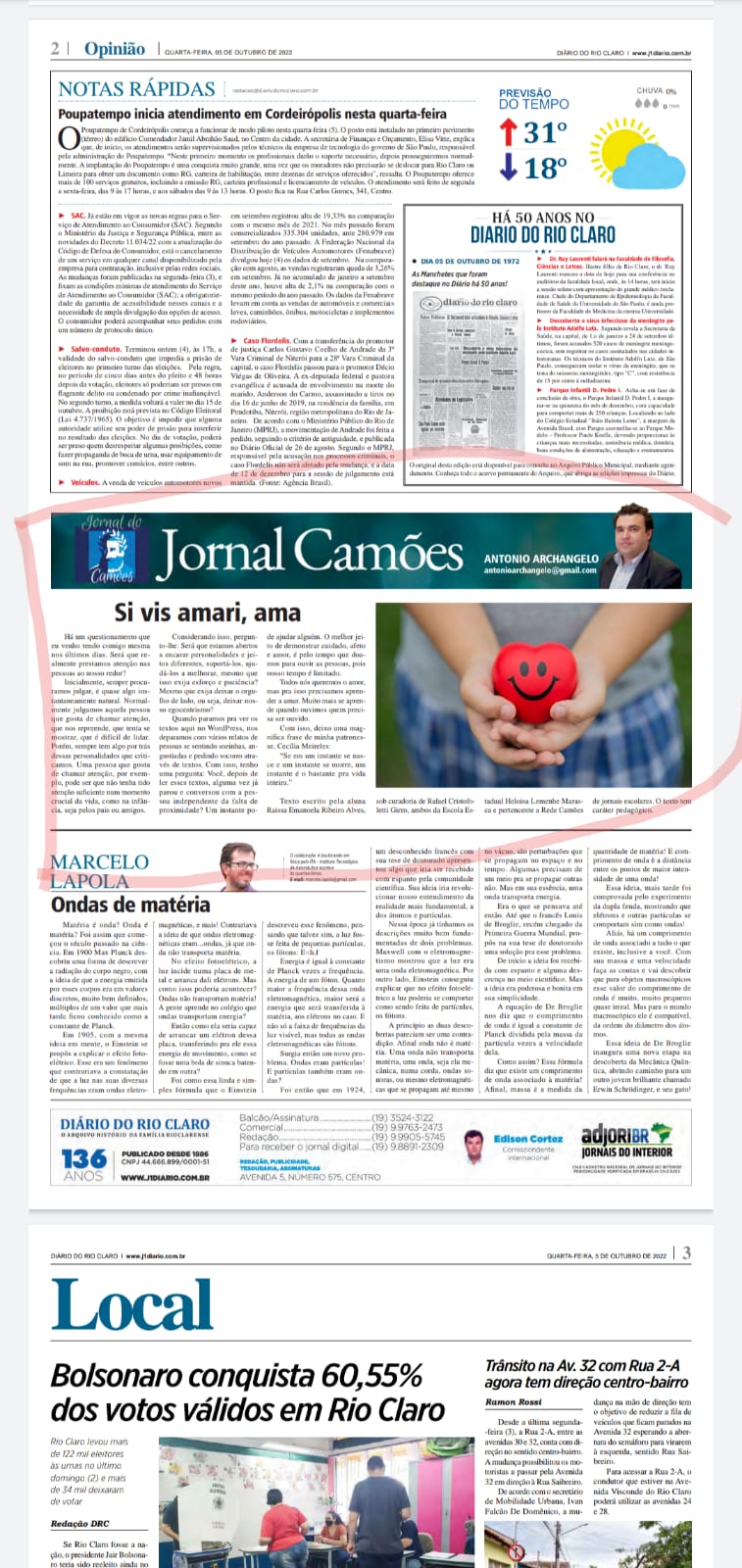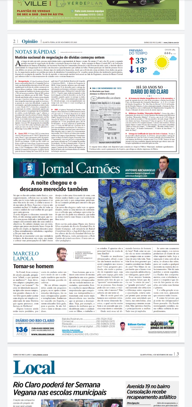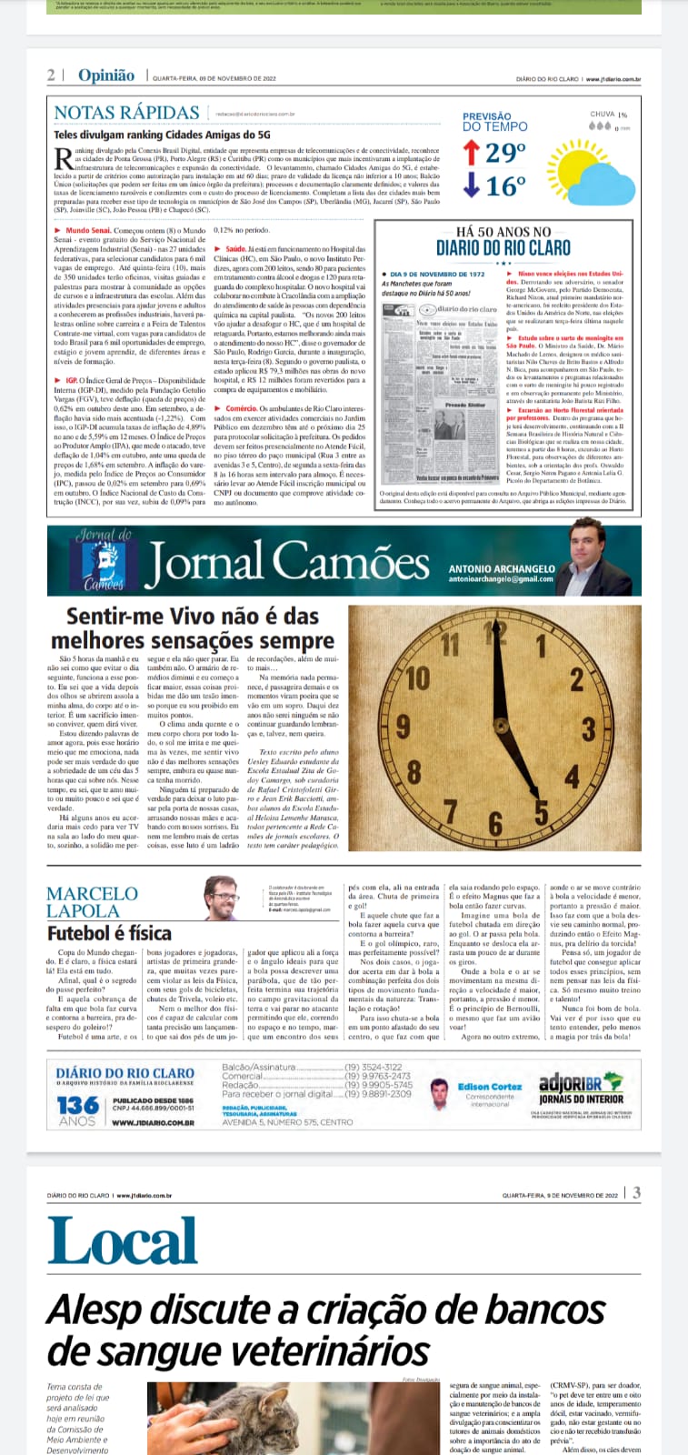 03 de novembro de 2022: A noite chegou e o descanso merecido também – https://www.j1diario.com.br/a-noite-chegou-e-o-descanso-merecido-tambem-por-antonio-archangelo/ (Diário do Rio Claro)