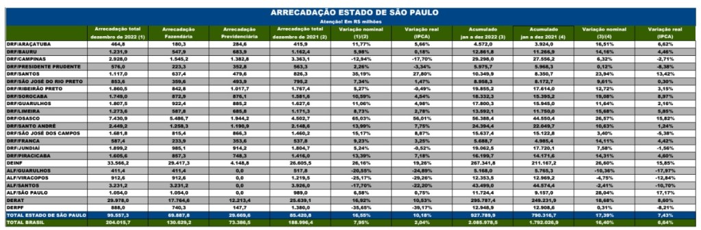 No mês de dezembro de 2022, a arrecadação da Receita Federal no estado de São Paulo foi de R$ 99,55 bilhões, o que representa acréscimo nominal de 16,55% e real (IPCA) de 10,18% em relação a dezembro de 2021, quando foram arrecadados R$ 85,42 bilhões no estado.