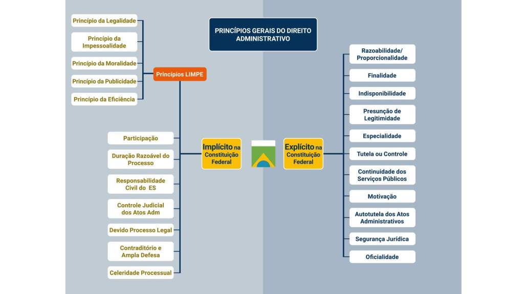 Os princípios explícitos, como já vimos, estão no artigo 37 da CF. E os implícitos encontrados na Lei nº 9.784/1999 e no artigo 2º da Lei nº 8.666/1993, a exemplo, são: supremacia do interesse público; indisponibilidade do interesse público; razoabilidade; proporcionalidade; autotutela; finalidade; motivação; moralidade; segurança jurídica; boa-fé etc.