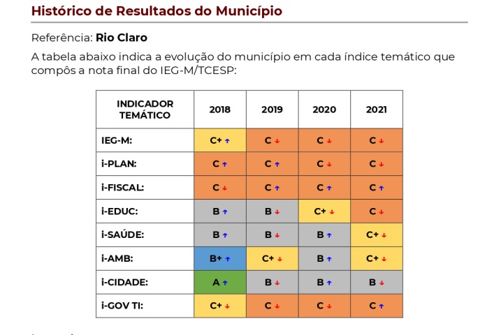 O IEG-M é o índice final que compila os resultados dos outros índices temáticos. Em 2021, Rio Claro obteve uma classificação “C”, indicando uma performance regular em sua gestão.