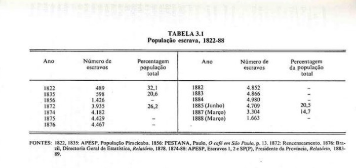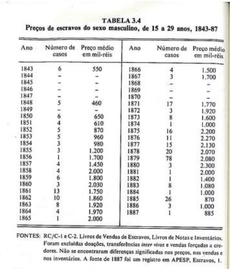 A mudança brusca para o café em fins da década de 1840 passou a exigir pesados insumos de mão-de-obra para a limpeza de terrenos, o plantio de mudas e a construção de terreiros. Infelizmente para os fazendeiros, esse período critico coincidiu com a real abolição do tráfico de escravos africanos. (Ele fora declarado ilegal em 1831, mas sem efeito algum.) O preço dos escravos triplicou nos 10 anos seguintes — enquanto o nivel geral de preços duplicou (Tab. 3. 4), Os fazendeiros de Rio Claro queixavam-se amargamente. Amador Lacerda Rodrigues Jordão, dono da fazenda de Santa Gertrudes, declarava a Assembléia provincial, em 1857, “hoje, para comprar um escravo, não apenas eles não existem, como os poucos que aparecem no mercado tem um preço excessivo. Os fazendeiros lutam com dificuldades para conservar seus bens”. Num relatário para o presidente da provincia, outro lamentava-se de que “muitos que estão comegando a trabalhar na lavoura … estão desanimados porque percebem que seus recursos são insuficientes para a compra de trabalho escravo. Essa escassez contrastava fortemente com a situação nas plantações do Vale do Paraiba, onde o influxo de escravos se processara em larga escala e aumentara até o tempo da proibição do tráfico.