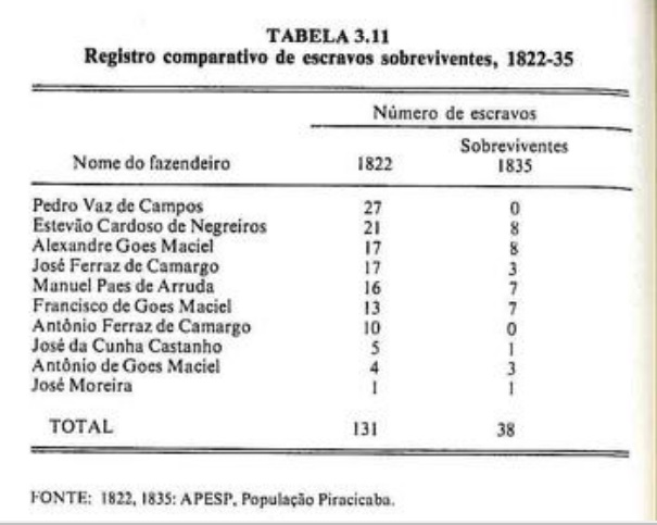 Possivelmente quase todos os escravos que não constavam da última relação tinham morrido. Escravos fugidos seriam anotados como estando presentes, mesmo muitos anos após o desaparecimento. Não parece que algum tivesse sido alforriado. Os nomes dos escravos da primeira lista foram procurados entre os dos agregados ou jornaleiros da segunda, mas nenhum foi localizado. É possível que os libertos não gostassem de permanecer num municipio onde tivessem sido escravos, mas havia poucos libertos em Rio Claro que tinham migrado de outros lugares apenas sete em 1835 puderam ser claramente assim identificados. Nenhum dos fazendeiros da Tab. 3.11 possuia plantações mais para o sertão, para onde os escravos pudessem ter sido transferidos, ou tinha filhos que tivessem estabelecido fazenda propria nesse interim. Apenas um, Pedro Vaz de Campos, declarou uma diminuição no tamanho de seu eito de escravos, levando a crer que, talvez em dificuldade, tivesse precisado vender alguns. Mesmo assim. uma epidemia poderia ter causado o desaparecimento, e a morte de uma grande parte dos escravos teria sido razão importante para uma falência e a necessidade de vender o resto.