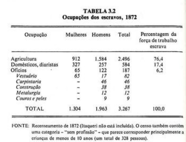 É provivel que alguns dos artesãos vivessem nas fazendas, cujos inventários referem-se de vez em quanto a dois ou três como canteiros, carpinteiros, telheiros ou ferreiros, Os outros eram ou aprendizes de artesãos livres da cidade ou simplesmente jornaleiros alugados por seus donos. As escravas não se dedicavam a oficio, com exceção dos trabalhos de agulha, nos quais competiam com mulheres livres num número oito vezes superior. Algumas das escravas das fazendas, ainda que registradas como domésticas, provavelmente costuravam, cuidavam dos doentes ou cozinhavam para o pessoal das plantações. Da lista de 1872 não constava nenhum escravo ocupado em atividade comercial ou não-manual.