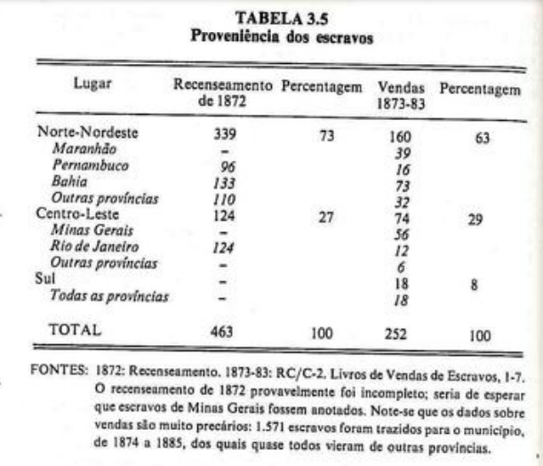A chegada de escravos de outros municipios e provincias era necessária não apenas porque se expandiam as plantações, mas porque a população escrava não se reproduzia. Isso não se deve à desproporção entre os sexos, a qual – pelo menos nessa região cafeicultora – era resultante do comércio de escravos e não sua causa. A população de imigranies europeus da geração seguinte era ainda mais desproporcional, com maior número de homens.