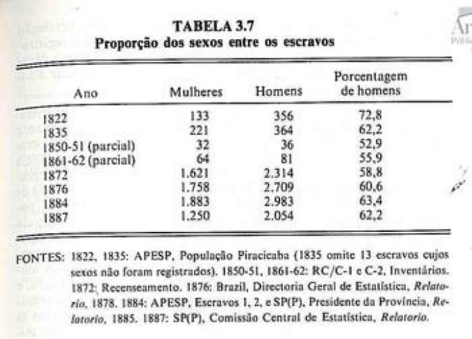 Tendo em vista o influxo de escravos de outros municipios ou provincias, os proprietários locais conseguiam contrabalançar o inevitivel envelhecimento da população escrava e manter uma maioria de homens (Tab. 3.6 e 3.7).A tendência no sentido da maior proporgio de escravos brasileiros já se notava mesmo antes da abolição do tráfico da Africa (Tab.3.8).