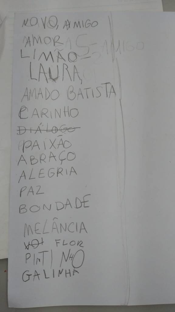 No início do projeto, os alunos, divididos em pequenos grupos, percorreram as dependências da escola para coletar palavras que achavam interessantes. Palavras como “amor”, “paixão” e “Amado Batista” foram algumas das escolhidas. Depois, os alunos se reuniram para escrever uma letra a partir das palavras coletadas.