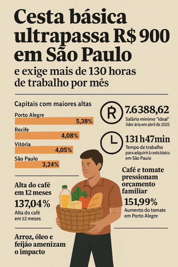 O custo da cesta básica subiu em 15 das 17 capitais brasileiras entre março e abril de 2025, segundo a nova edição da Pesquisa Nacional da Cesta Básica de Alimentos, realizada pelo DIEESE. São Paulo registrou o maior valor: R$ 909,25, enquanto Aracaju teve o menor custo: R$ 579,93.