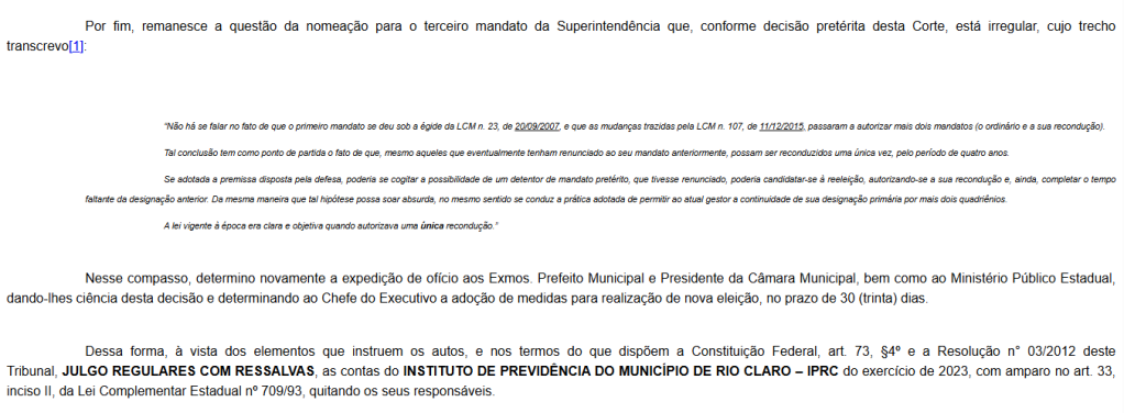 O TCE voltou a bater na mesma tecla: a recondução do atual superintendente para um terceiro mandato consecutivo é ilegal. O parecer lembra que a Lei Complementar Municipal 023/2007 só permite uma única recondução. Mesmo com alterações posteriores, a prática adotada em Rio Claro já foi considerada irregular em julgamento anterior (TC-2681/989/21). O Tribunal deu 30 dias ao Executivo para realizar nova eleição, oficiando também a Câmara Municipal e o Ministério Público Estadual.