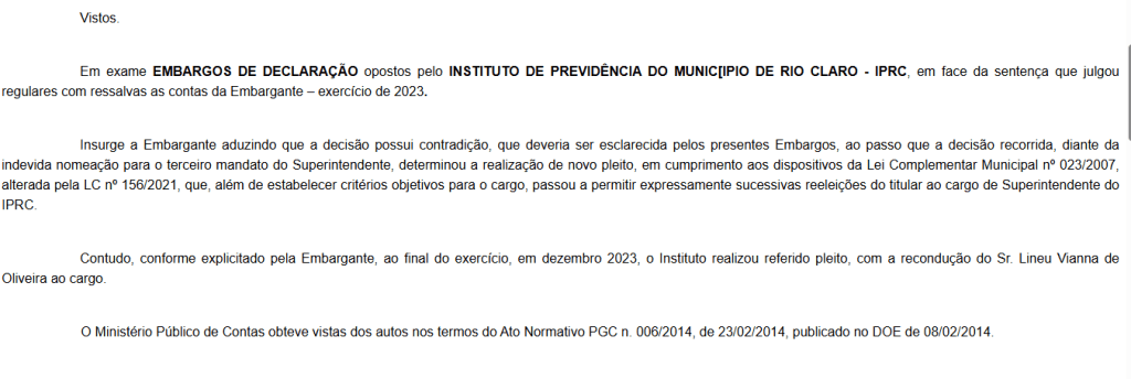 O Tribunal de Contas do Estado de São Paulo (TCE-SP) rejeitou oficialmente os embargos de declaração apresentados pelo Instituto de Previdência do Município de Rio Claro (IPRC), reafirmando a ilegalidade da terceira recondução de Lineu Vianna ao cargo de superintendente. A decisão, publicada no Diário Oficial de 26 de junho de 2025, põe fim à mais recente manobra jurídica para manter o dirigente no comando, mesmo após determinação expressa para realização de nova eleição. Ontem, o Portal Archa já havia antecipado o entendimento, conforme despacho do Tribunal.