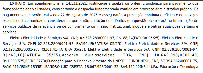 Prefeitura de Rio Claro. Extrato – Quebra de ordem cronológica de pagamentos. Diário Oficial do Município de Rio Claro, edição nº 1834, p. 59, 22 ago. 2025.