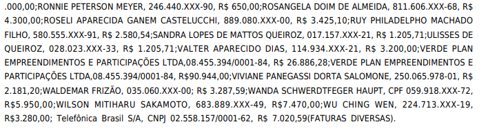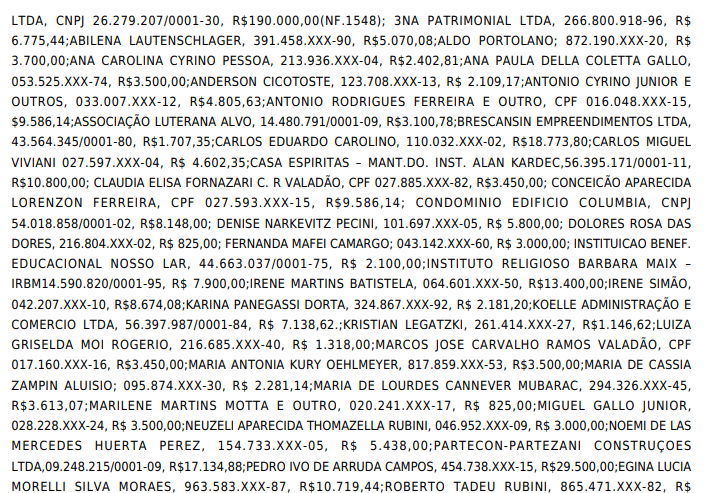 - Além de dezenas de pessoas físicas e jurídicas com valores que variam entre R$ 650,00 e R$ 18.773,80, incluindo aluguéis, honorários e locações.